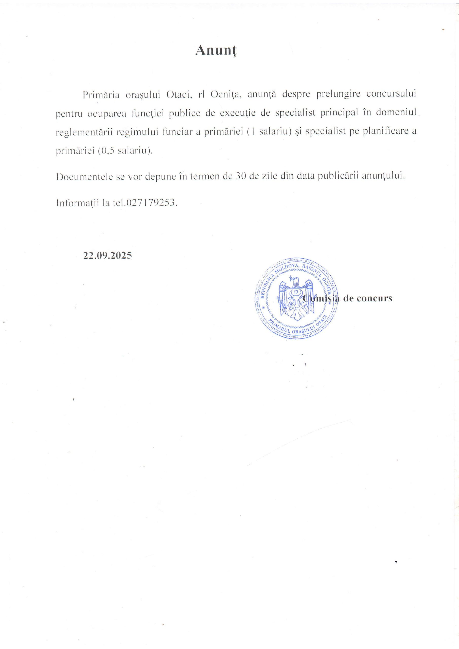 Anunț: Prelungirea concursului pentru ocuparea funcției publice de execuție de specialist principal în domeniul reglămentării funciar a primăriei