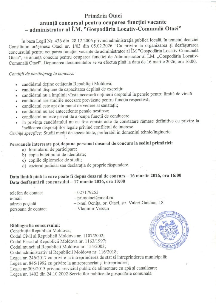 Primăria Otaci anunță prelungirea concursului pentru ocuparea funcției vacante — administrator al Î.M. ”Gospodăria Locativ-Comunală Otaci”